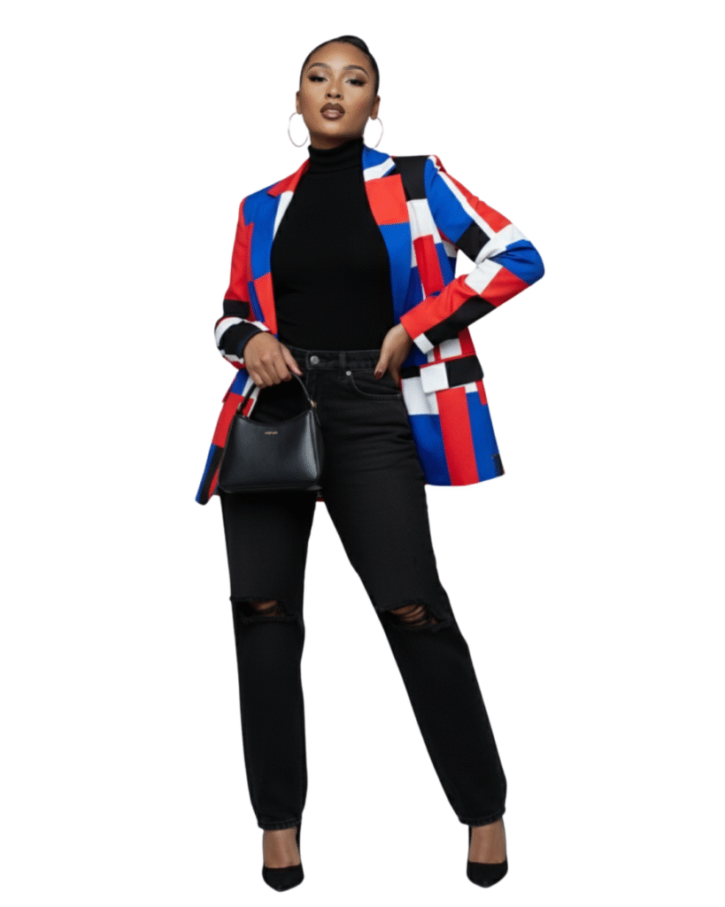 Ready to truly stand out? Throw on a vibrant, colorful blazer, especially one with a striking geometric pattern. This piece instantly transforms your all-black foundation into a work of art, bringing energy, personality, and a playful yet sophisticated edge.