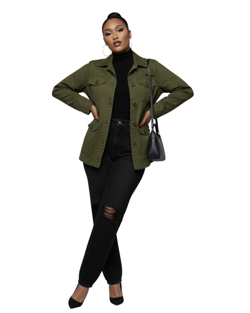 When you want to blend comfort with a touch of rugged style, the green utility jacket is an excellent choice. Its practical design, often featuring multiple pockets and a relaxed fit, adds a cool, utilitarian edge to your all-black base. This look is perfect for casual weekend adventures, outdoor events, or adding a stylish layer on cooler days. The olive green tone offers a subtle pop of color that complements the black beautifully.