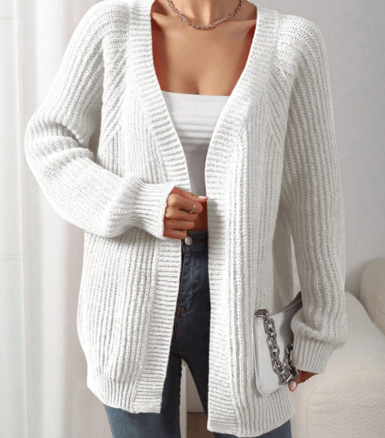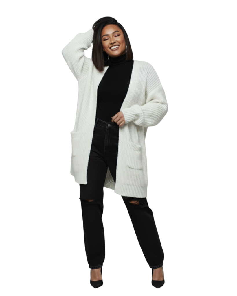 Beyond structured coats and jackets, a soft, oversized white cardigan offers another wonderful way to style your all-black base. This cozy layer instantly introduces a touch of warmth, comfort, and a chic, relaxed vibe.