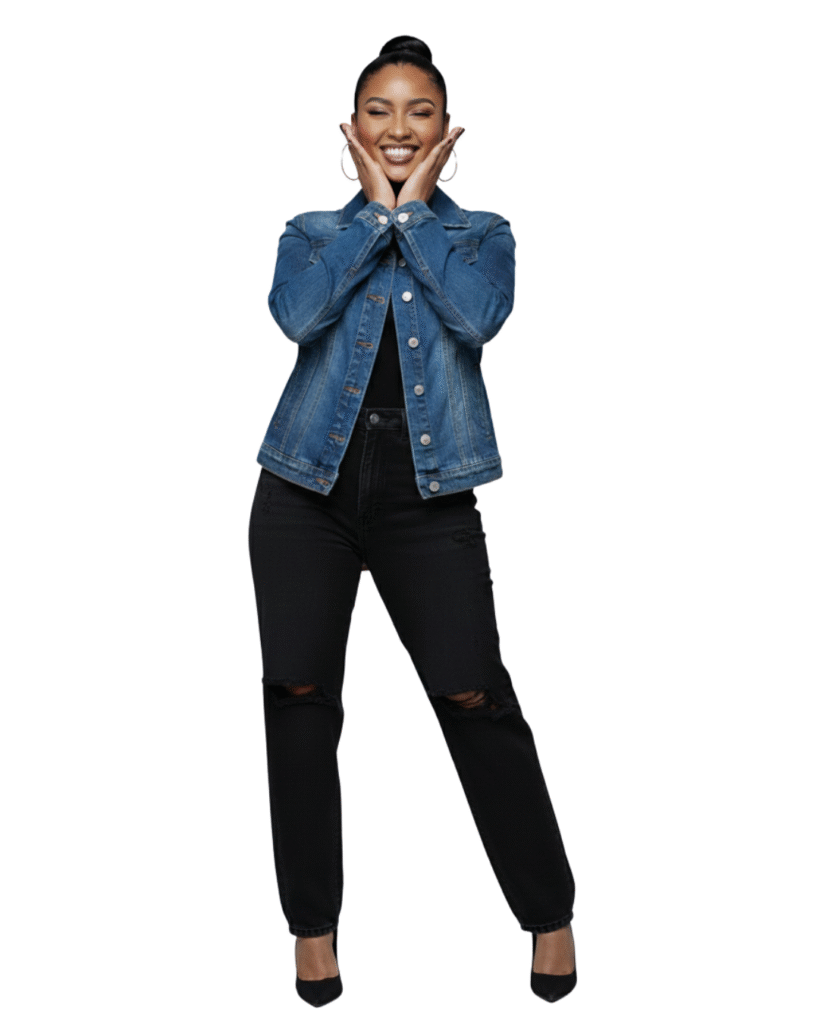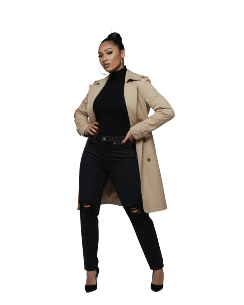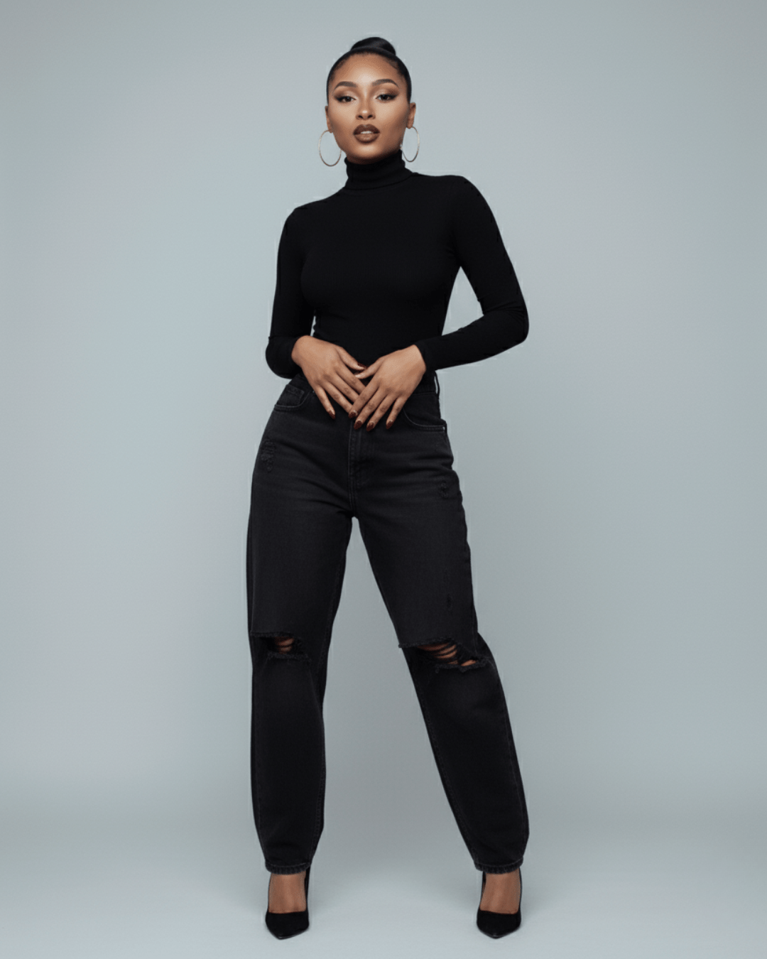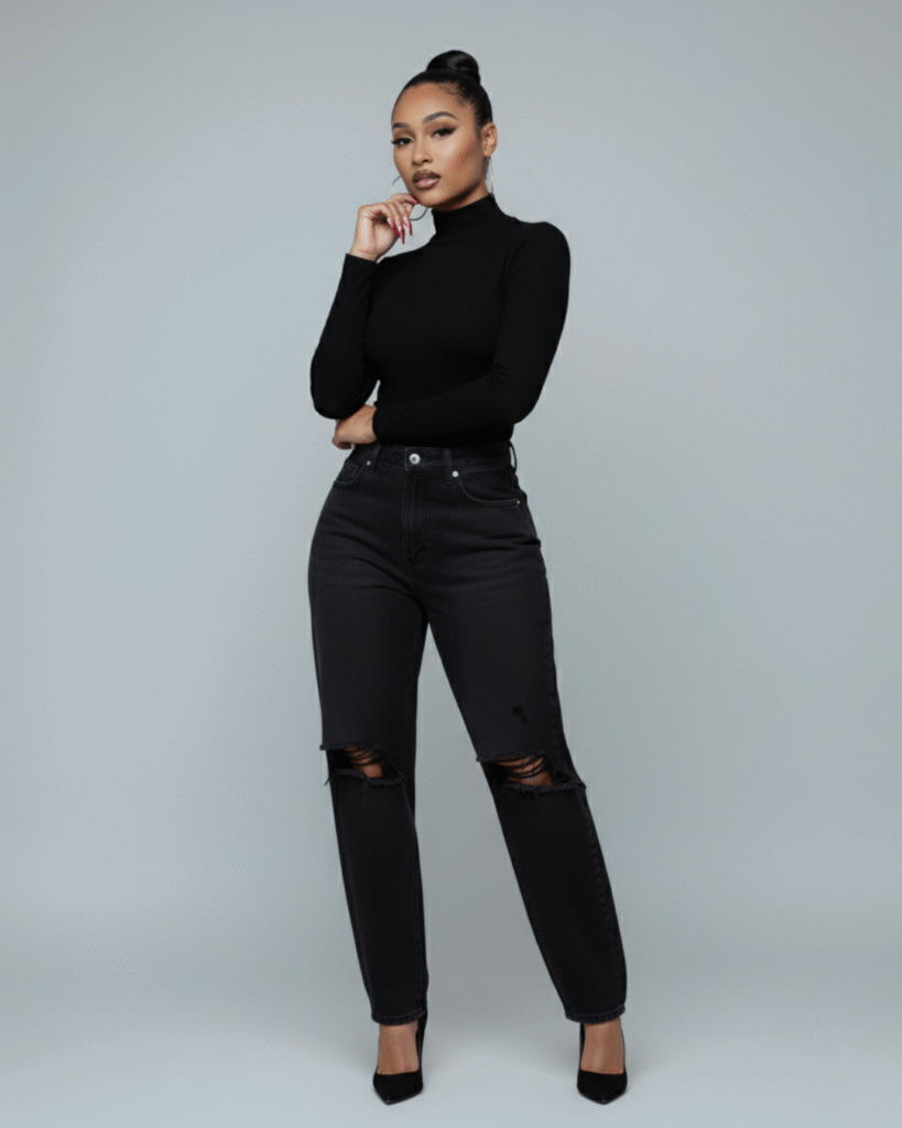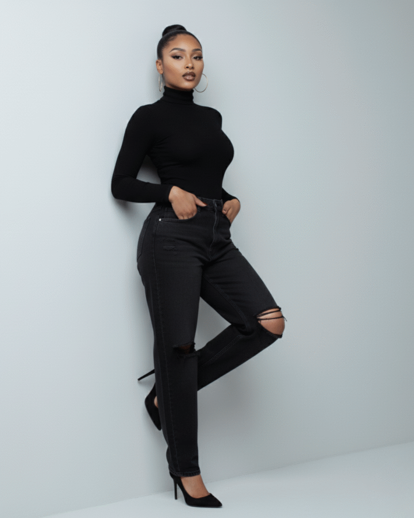 So there you have it; proof that a simple all-black outfit is anything but basic. It’s your ultimate style foundation, ready to be transformed by whatever jacket or coat suits your mood. Whether you’re craving the laid-back vibe of denim, the bold statement of red leather, the timeless look of a trench coat, or the cozy charm of a cardigan, your all-black turtleneck, ripped jeans, and pumps ensemble is asecret weapon.