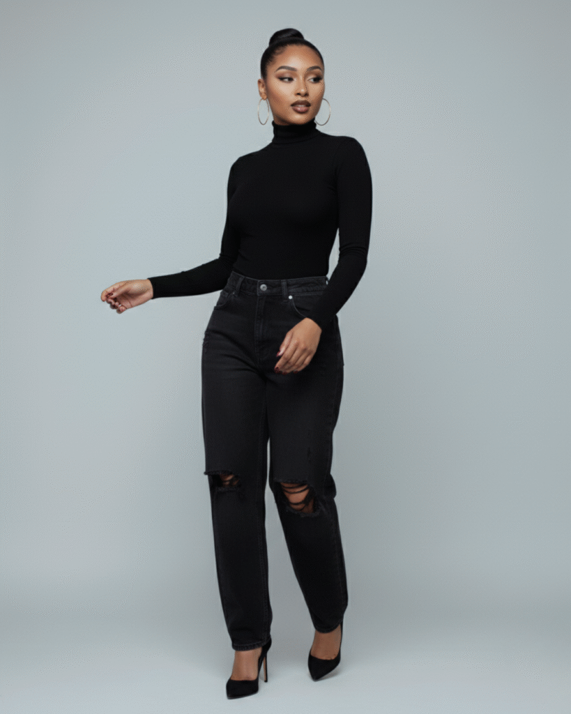 Let’s start with the core pieces. A fitted black turtleneck is a timeless and flattering choice that works year-round. Paired with distressed black jeans, you get an edgy yet comfortable vibe. And black pumps? They instantly elevate the look, adding a touch of refinement. This combination creates a lean, elongating silhouette that’s incredibly versatile.